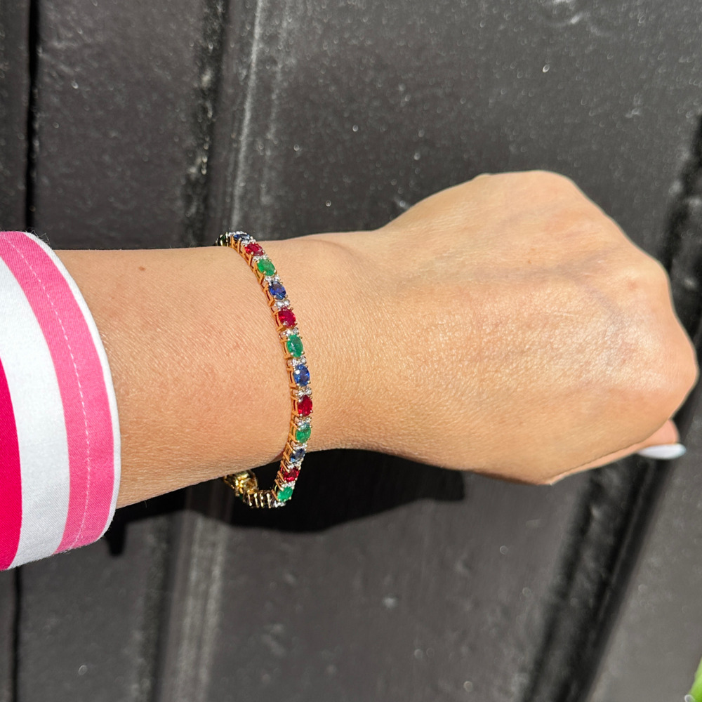 This bracelet is designed with prong settings and showcases alternating oval-shaped sapphires, rubies, and emeralds, measuring 5.5 x 3.85 mm and weighing approximately a total of 10 carats. The gemstones are interspersed with small round diamonds, which weigh approximately 0.50 carats in total.