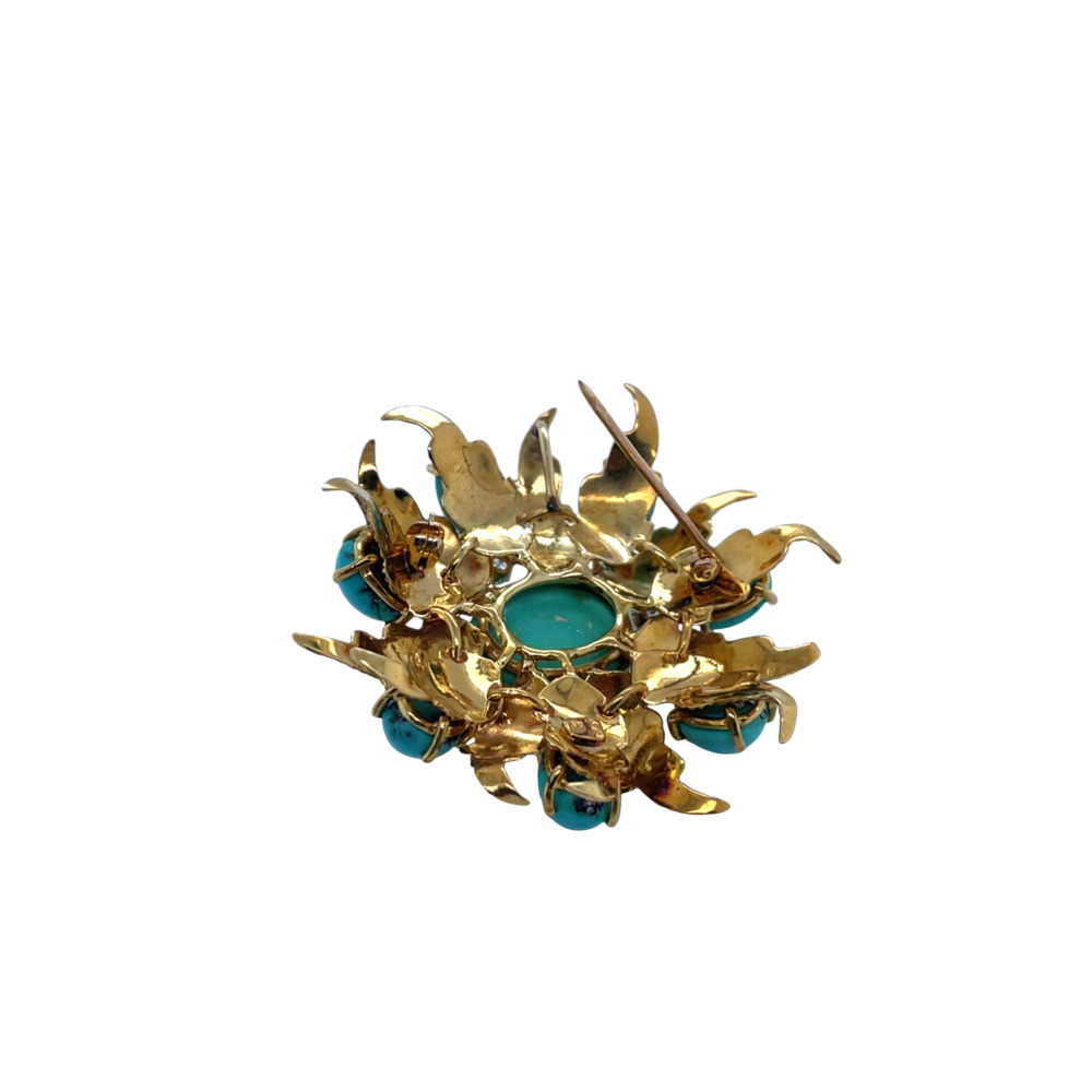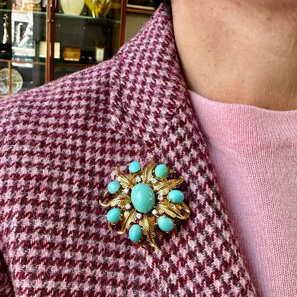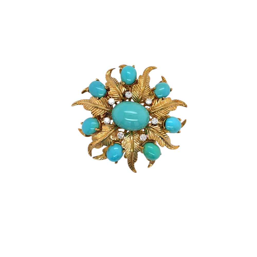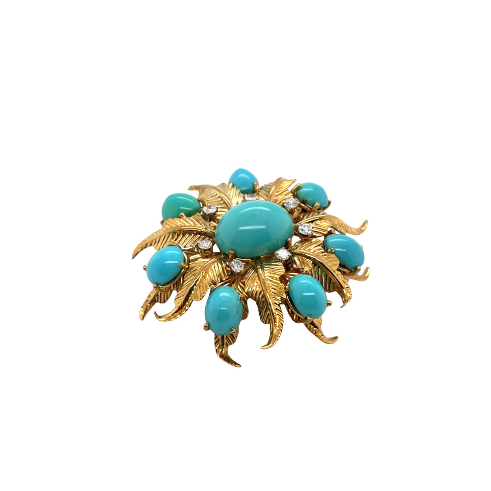 The large floral motif brooch is set with 7 oval-shaped turquoise and 7 round brilliant-cut diamonds weighing approximately 0.50 carat total. The brooch measures 2 ½ x 2 inches.