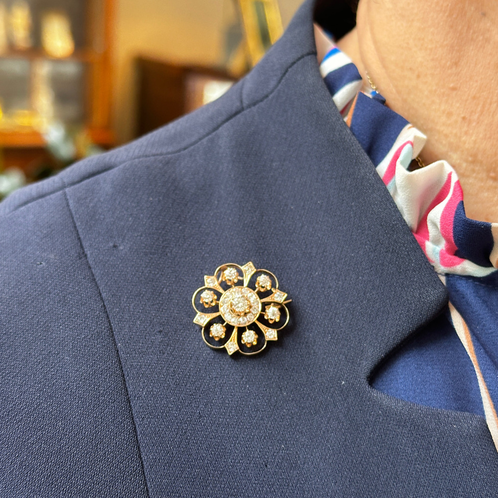 The starburst motif is set with small old mine-cut diamonds weighing a total of 1.50 carats, measuring 24mm and weighing 4.4 dwts.