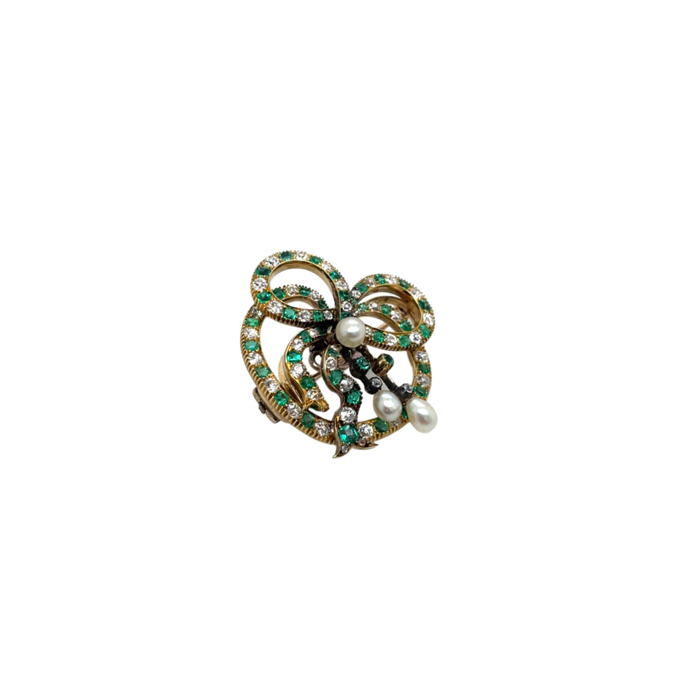 The bow motif pavé set with fine emeralds weighing approximately 1.80 carats total, alternating with small old mine-cut diamonds weighing approximately 2.0 carats total, and suspending 2 small pearls.