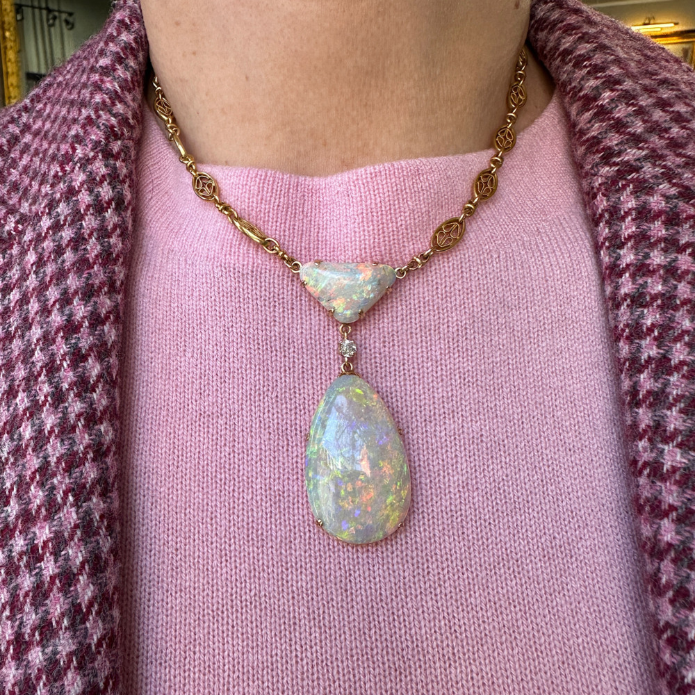 The pendant-style set features one large pear-shaped opal measuring 36.7 x 21.9 mm, weighing approximately 13.60 carats, suspended by one small old mine-cut diamond weighing 0.40 carat and a triangular-shaped opal measuring 21.4 x 13.5mm, weighing approximately 5.80 carats; the clasp is set with an oval-shaped opal weighing approximately 2.50 carats. The necklace measures 15.5 inches long.