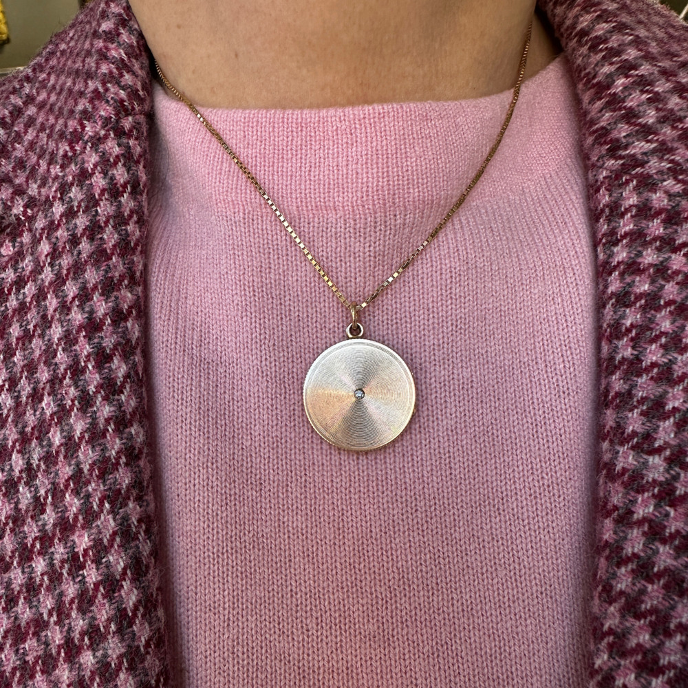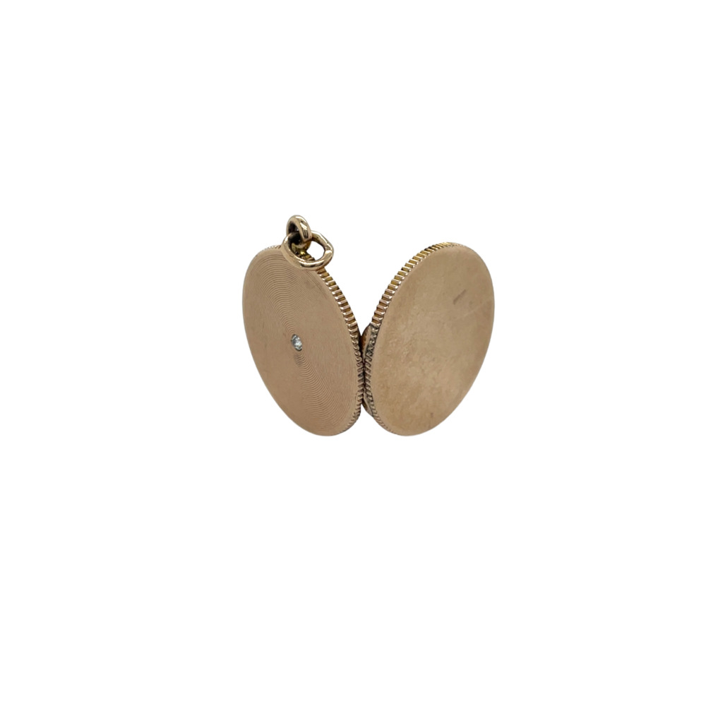The round locket measures 25mm, with an engraved top and set with one small old mine-cut diamond weighing approximately 0.05 carat.