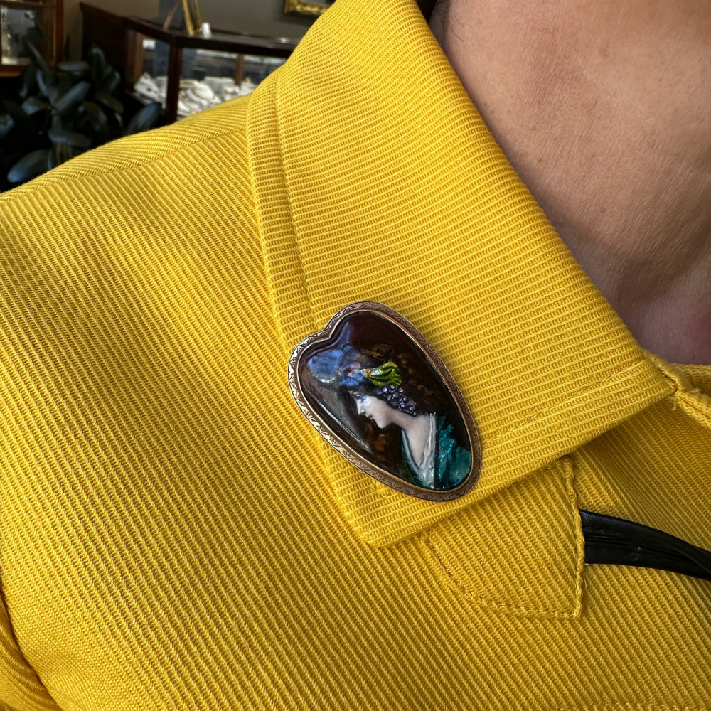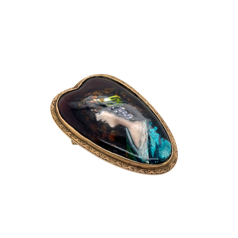 The heart-shaped depicts a young woman with grapes in her hair, measuring 1 ¾ x 1 ¼ inches.