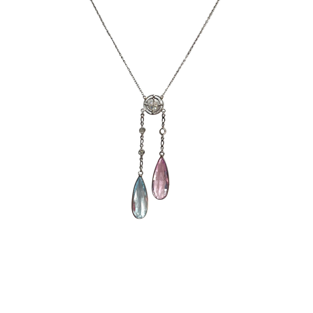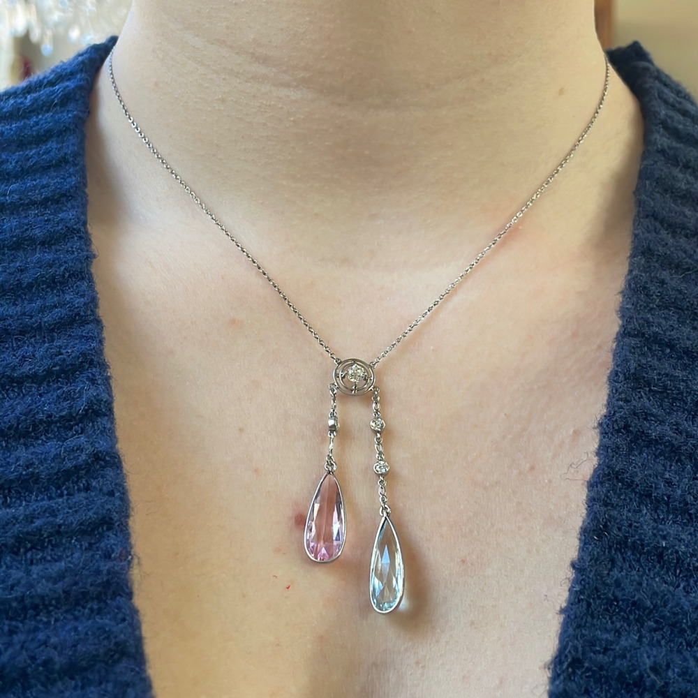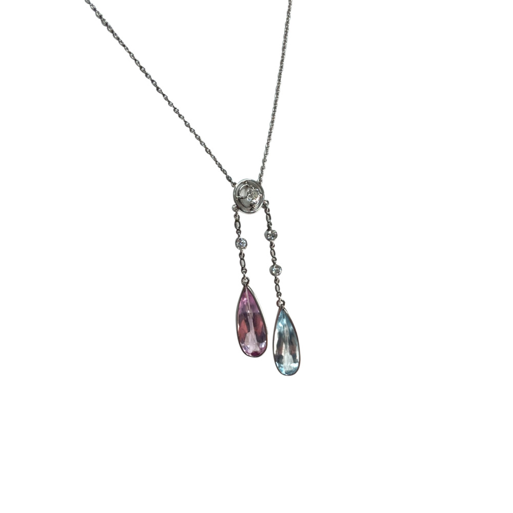 The twin drop collet set with one pear-shaped aquamarine weighing approximately 3.15 carats, pink topaz weighing 3.60 carats, suspended by 4 Old European cut diamonds weighing approximately 0.40 carats total, measuring 16 inches long.