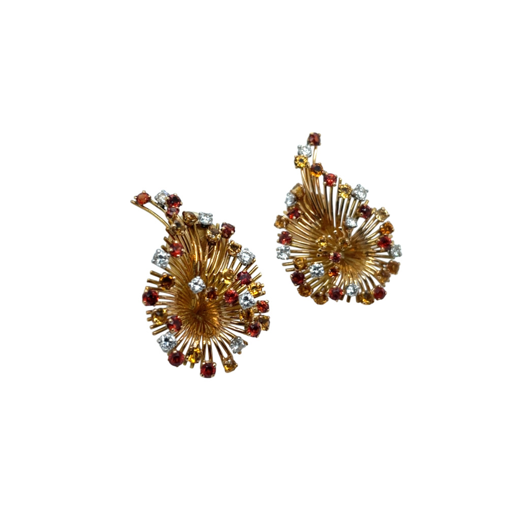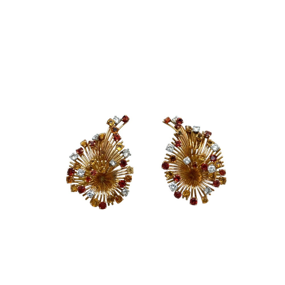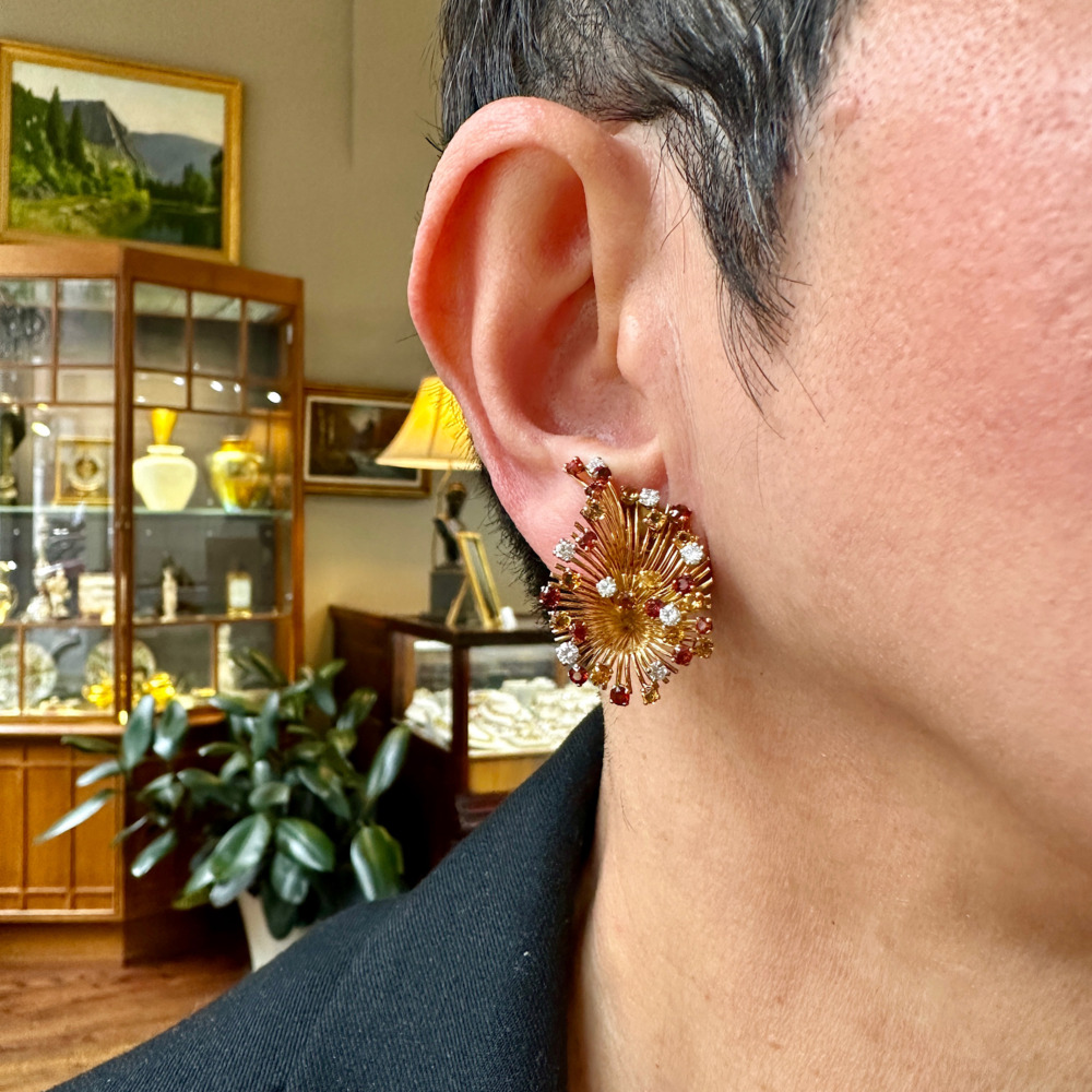 The starburst motif is set with 16 small round brilliant-cut diamonds weighing approximately 0.80 carats total and 50 small multicolor citrines. The earring measures 1 ¼ x 1 inch and weighs 8.6 dwts.