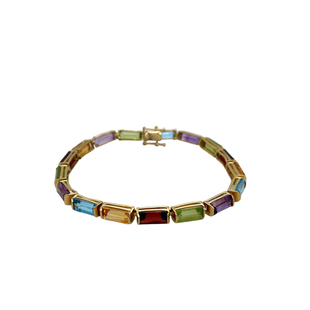 Set with emerald cut semi-precious stones, blue topaz, amethyst, peridot, garnet, and citrines measuring 4mm wide and 6 ¾ inches long.