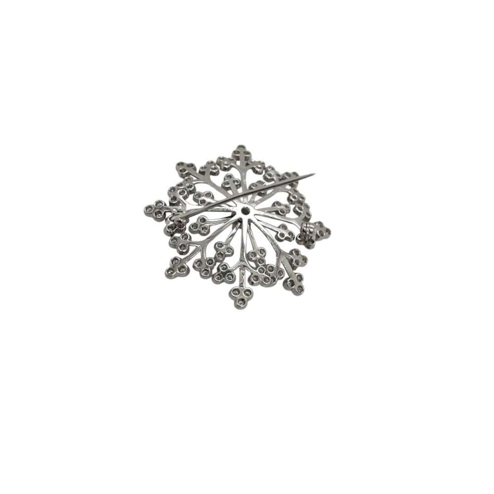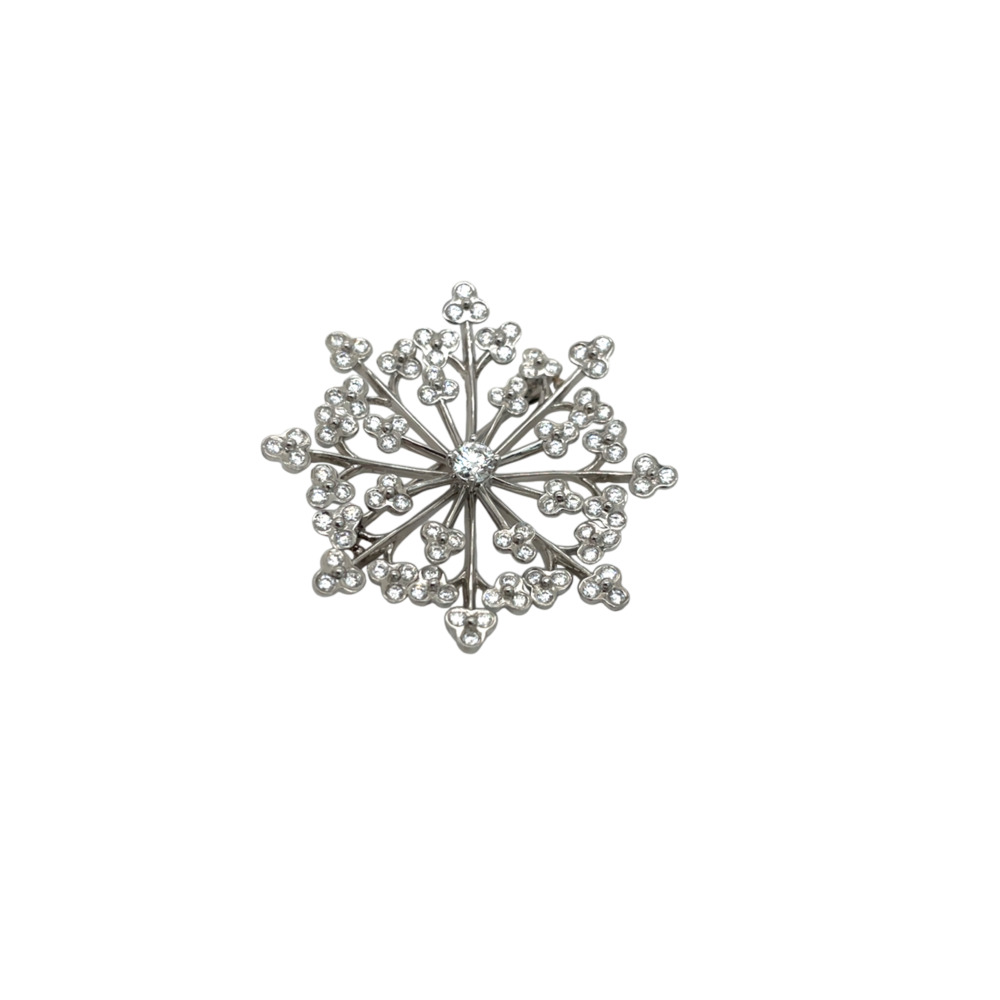 The snowflake motif brooch is set with small round brilliant-cut diamonds weighing approximately 1.50 carats total, and measures 1 ½ inches.