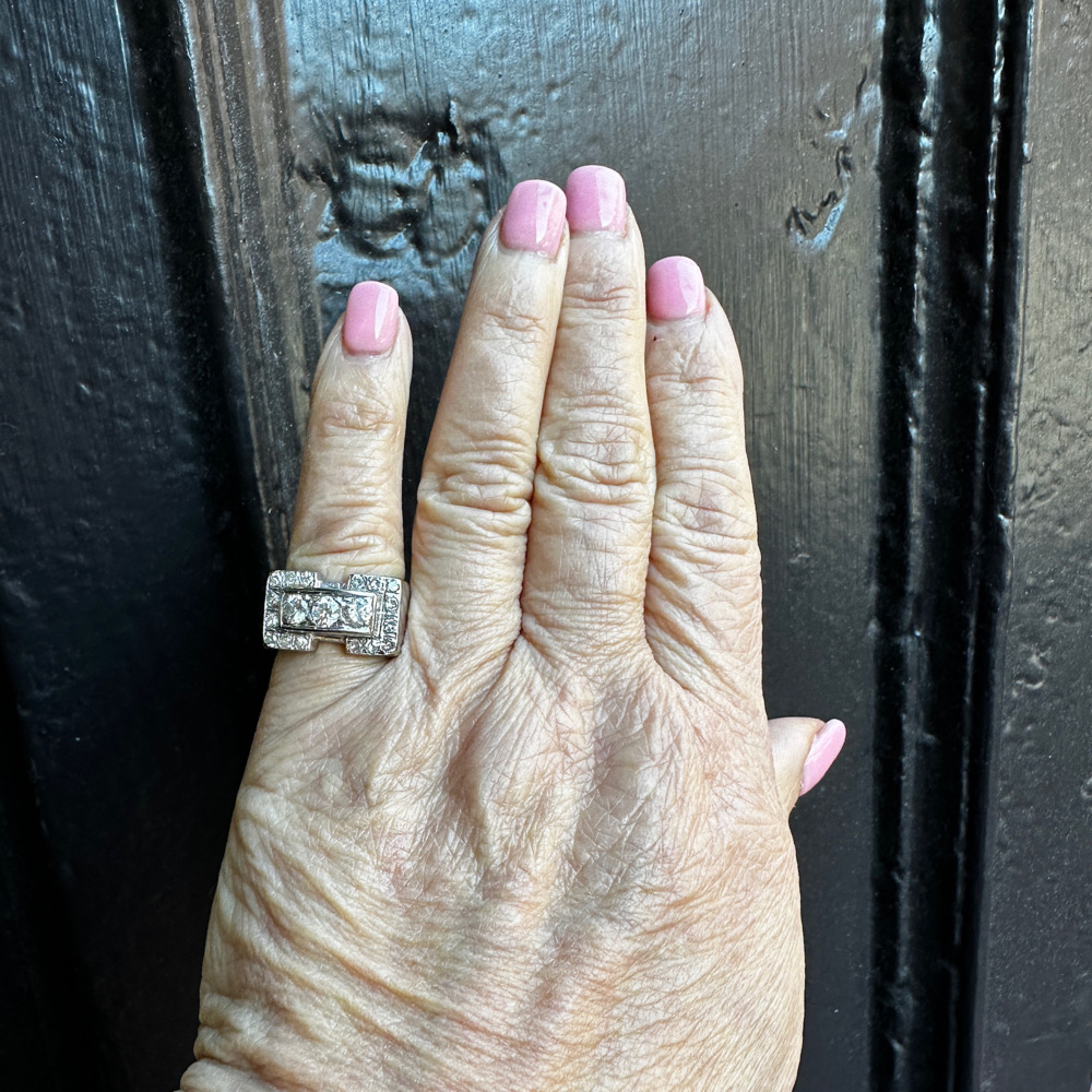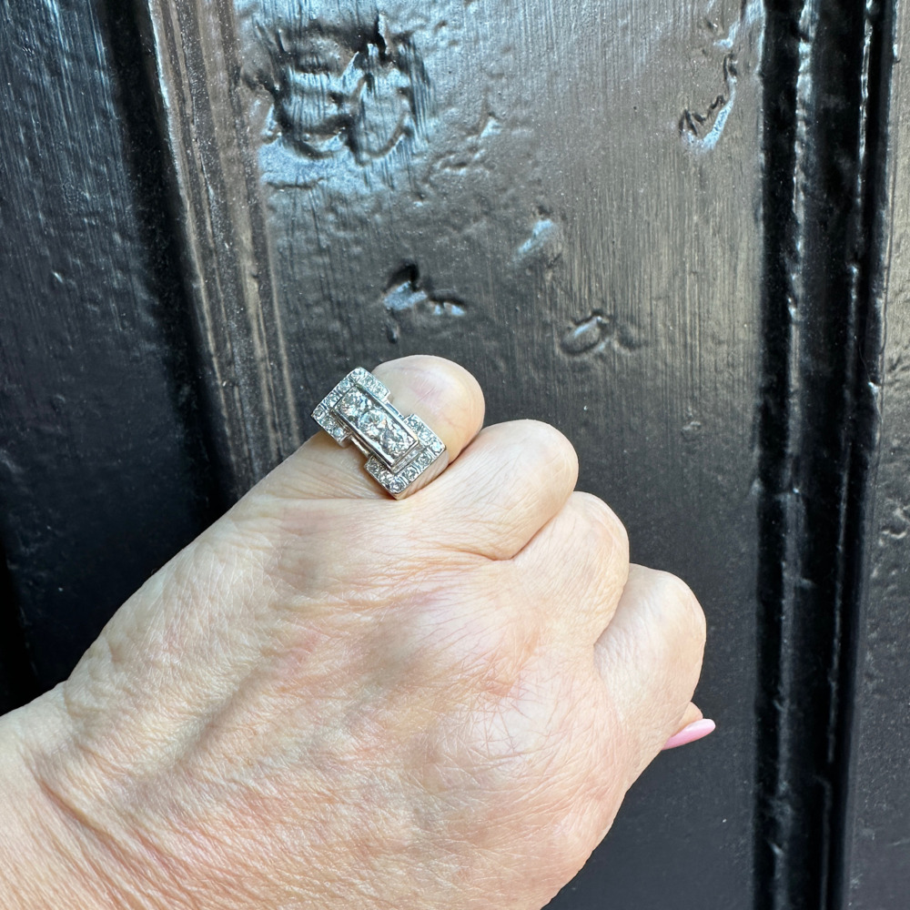 The geometric design set with 3 round diamonds weighing approximately 0.90 carat total, surrounded by small single cut diamonds weighing approximately 0.32 carat total.