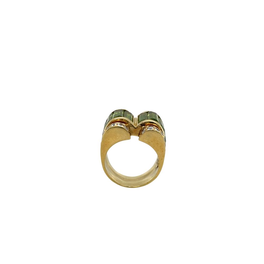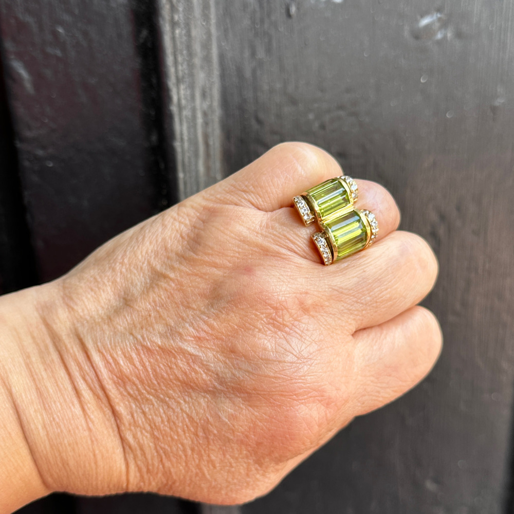 The wide band set with a baguette-cut peridot and flanked by small round brilliant-cut diamonds, weighing approximately 0.72 carats total.