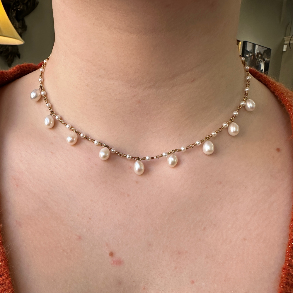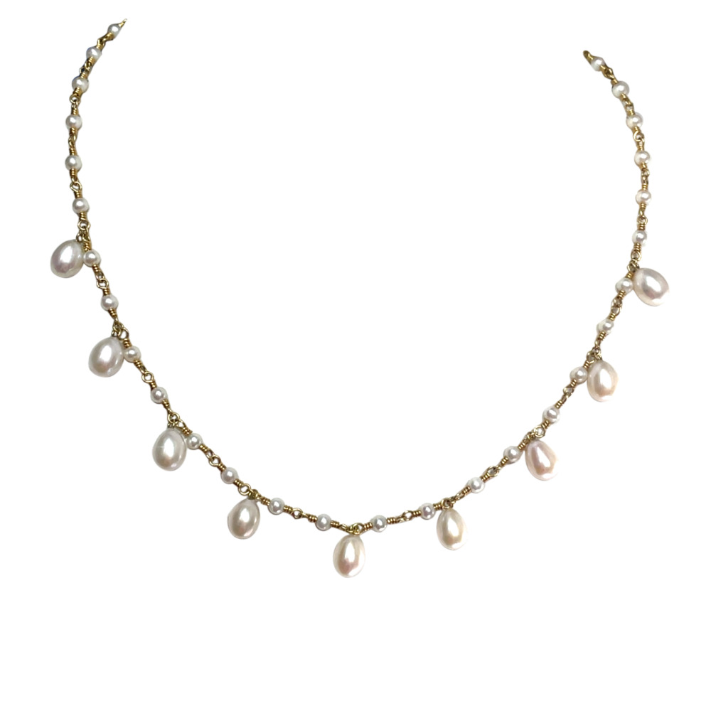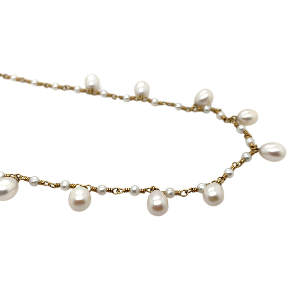 The twist wire alternated with small round freshwater pearls, suspending 15.5-inch-long pear-shaped freshwater pearls.