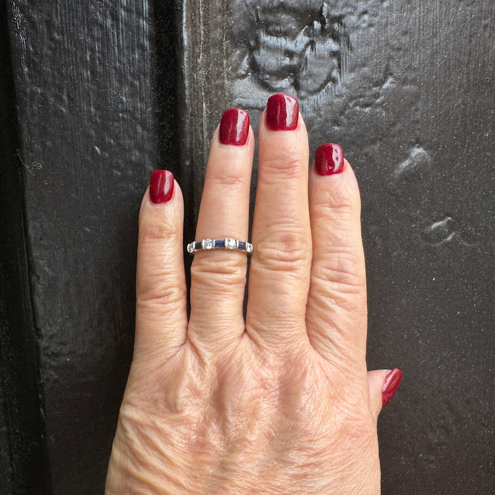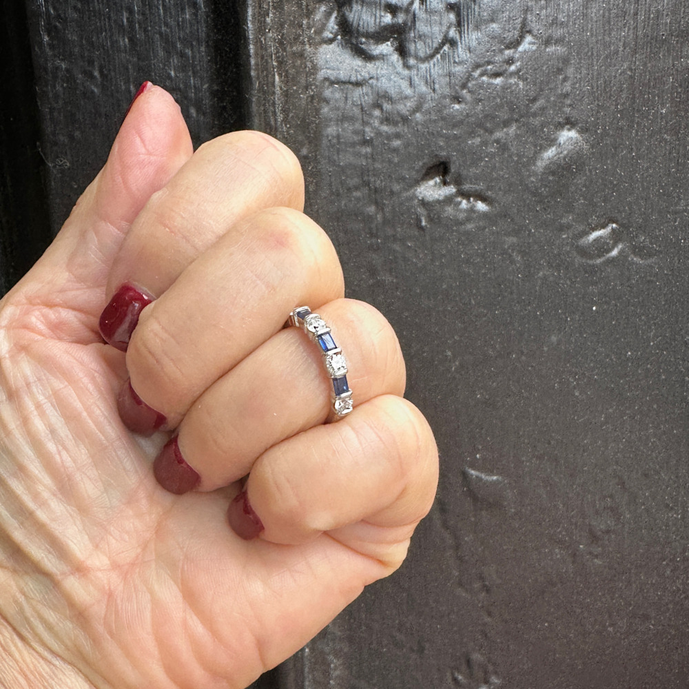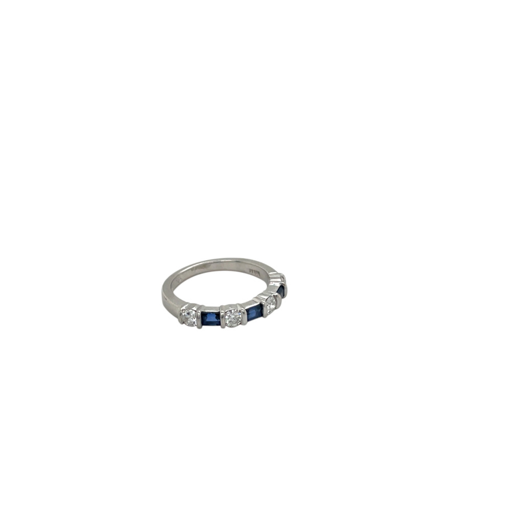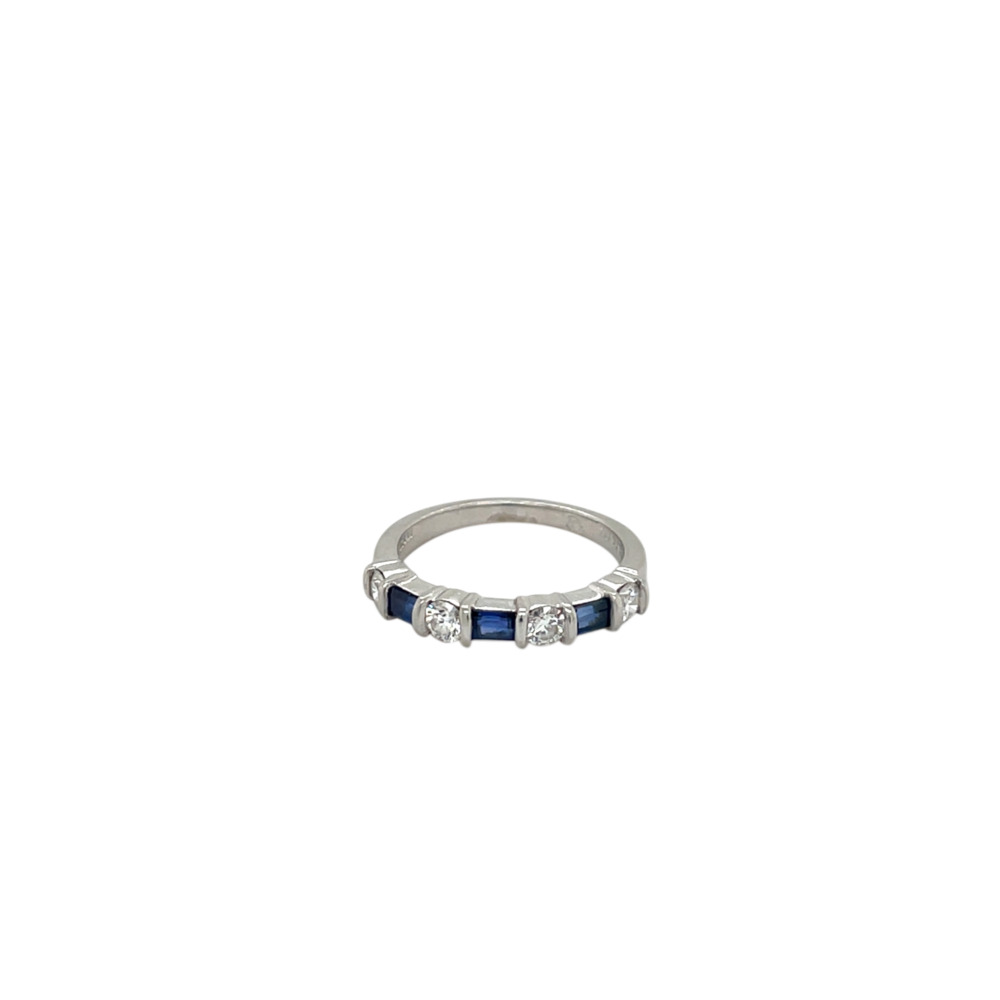 The halfway style set with 4 round brilliant-cut diamonds weighing approximately 0.48 carat total, alternating with 3 baguette-cut sapphires weighing approximately 0.45 carat total.