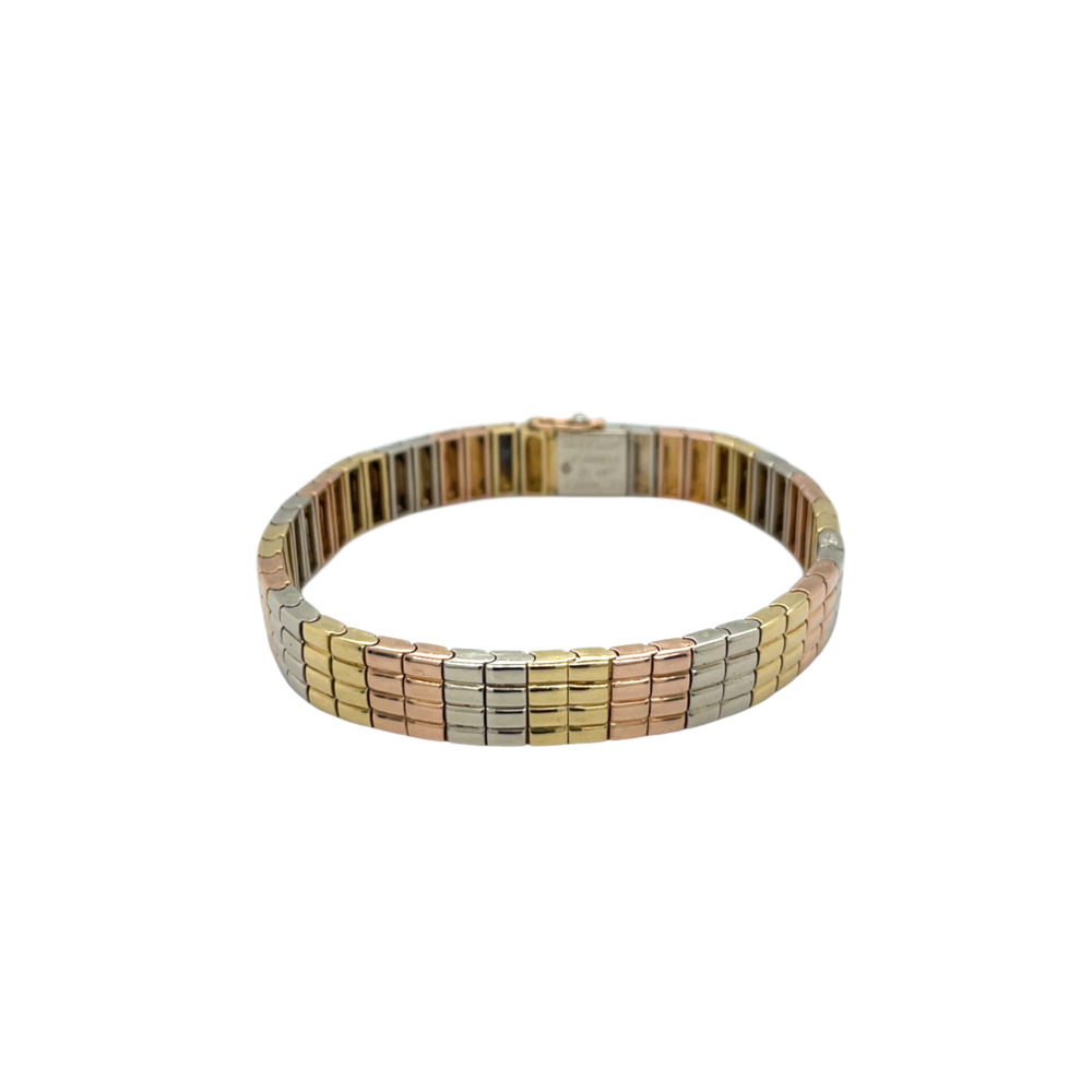 The flat triple color gold alternating sections of white, rose, and yellow links, measuring 9.1mm wide and 7 inches long.