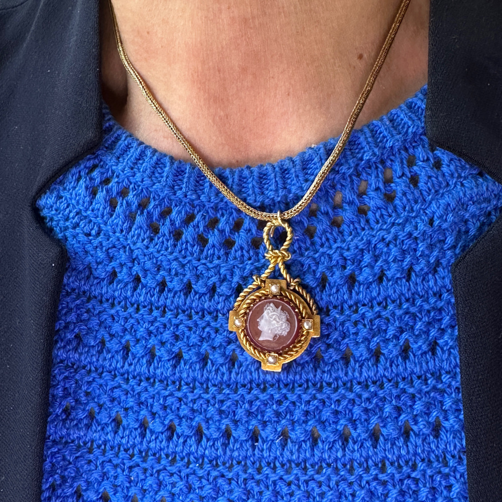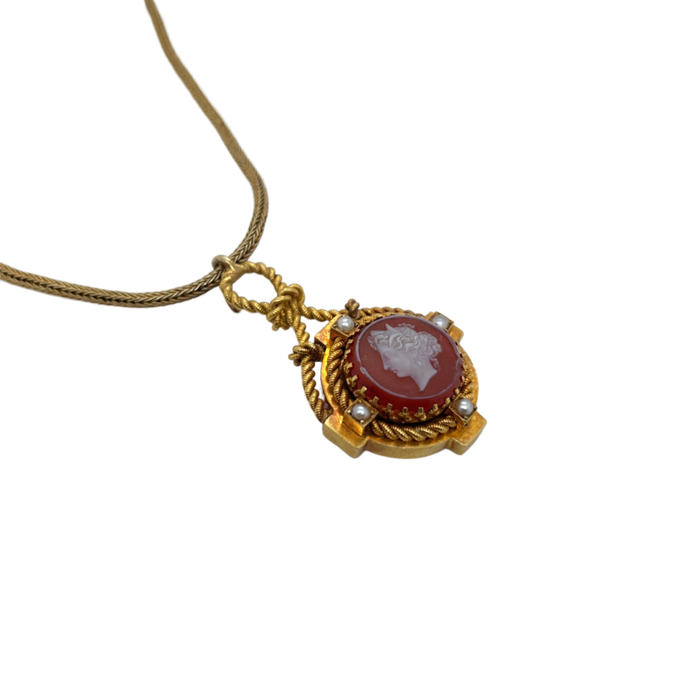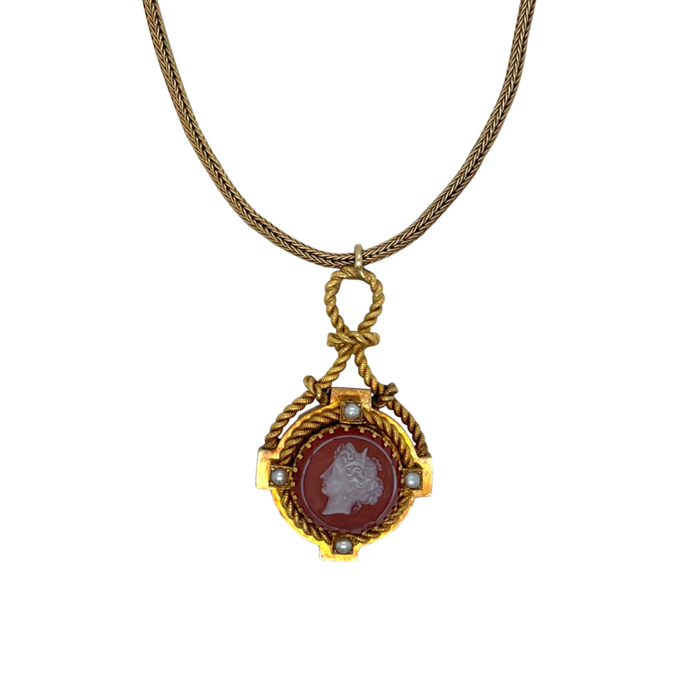 The shield-shaped set with one round carnelian cameo depicting a young woman, surrounded by four small half-pearls, decorated with rope wire, and suspended by a mesh chain.
