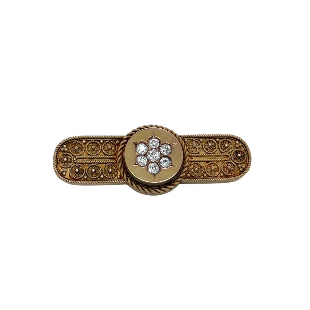 The Bar-style brooch set with 7 old mine-cut diamonds, weighing approximately 1.0 carat total, and decorated with bead and wire work.