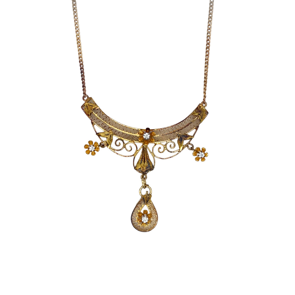 The open work style set with 4 small old mine cut diamonds weighing approximately 0.08 carat total, suspended by an 18-inch chain.