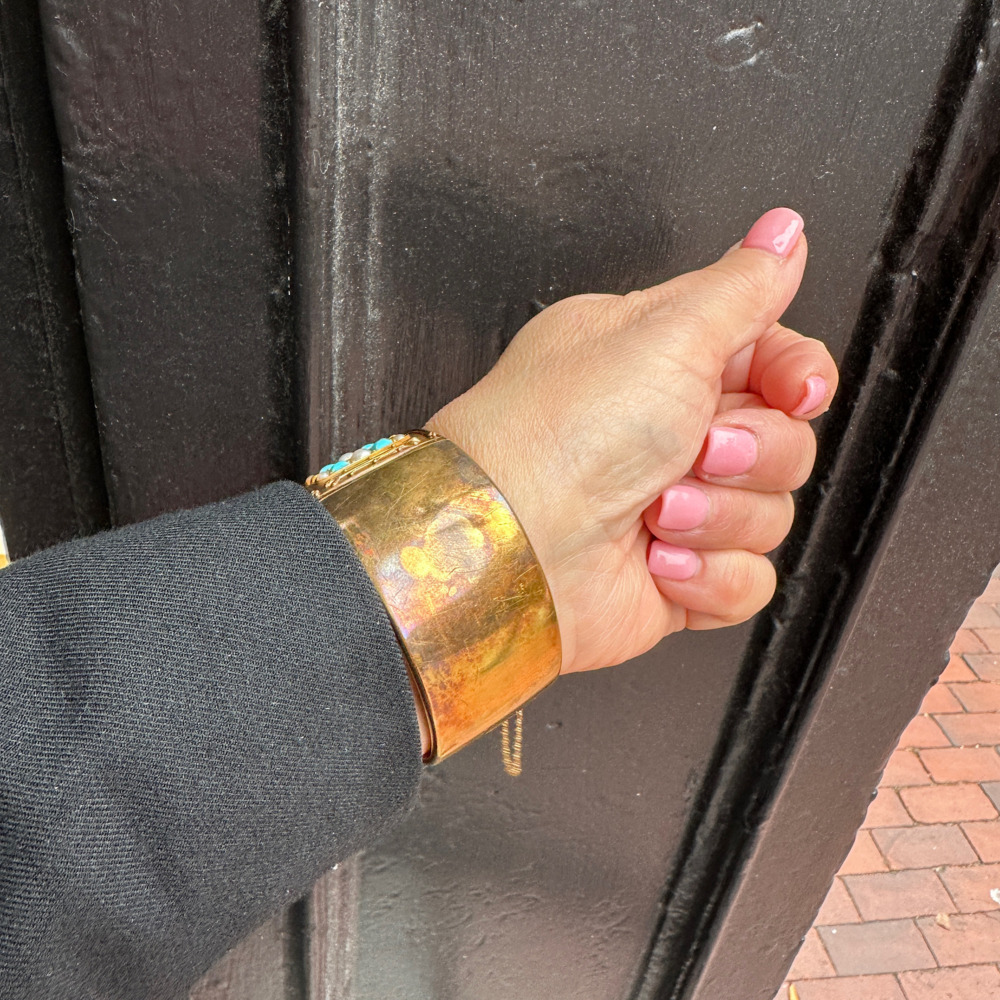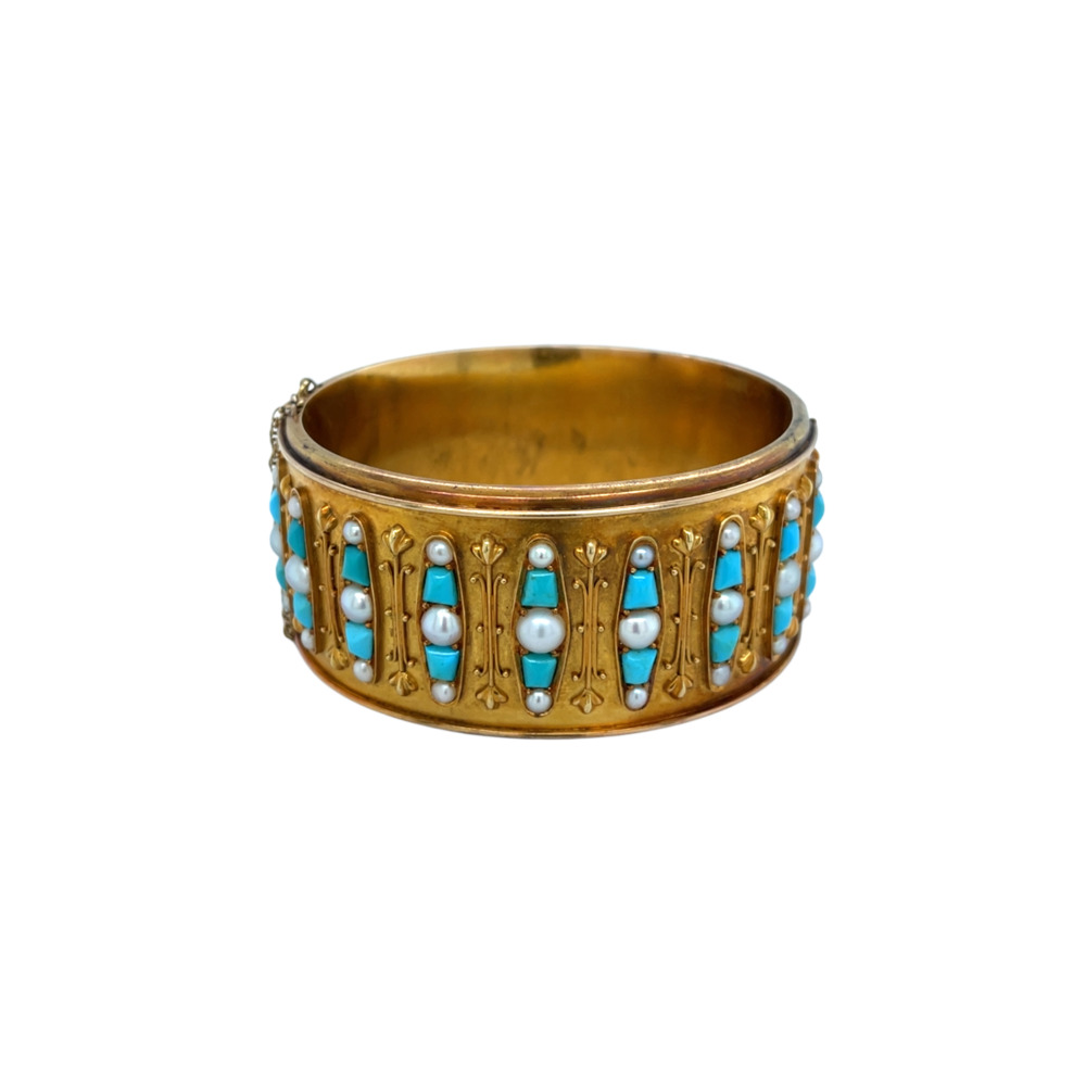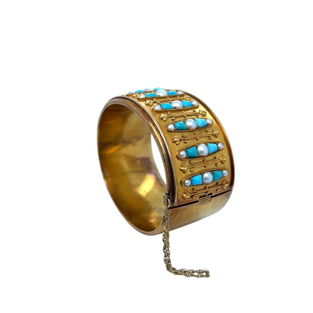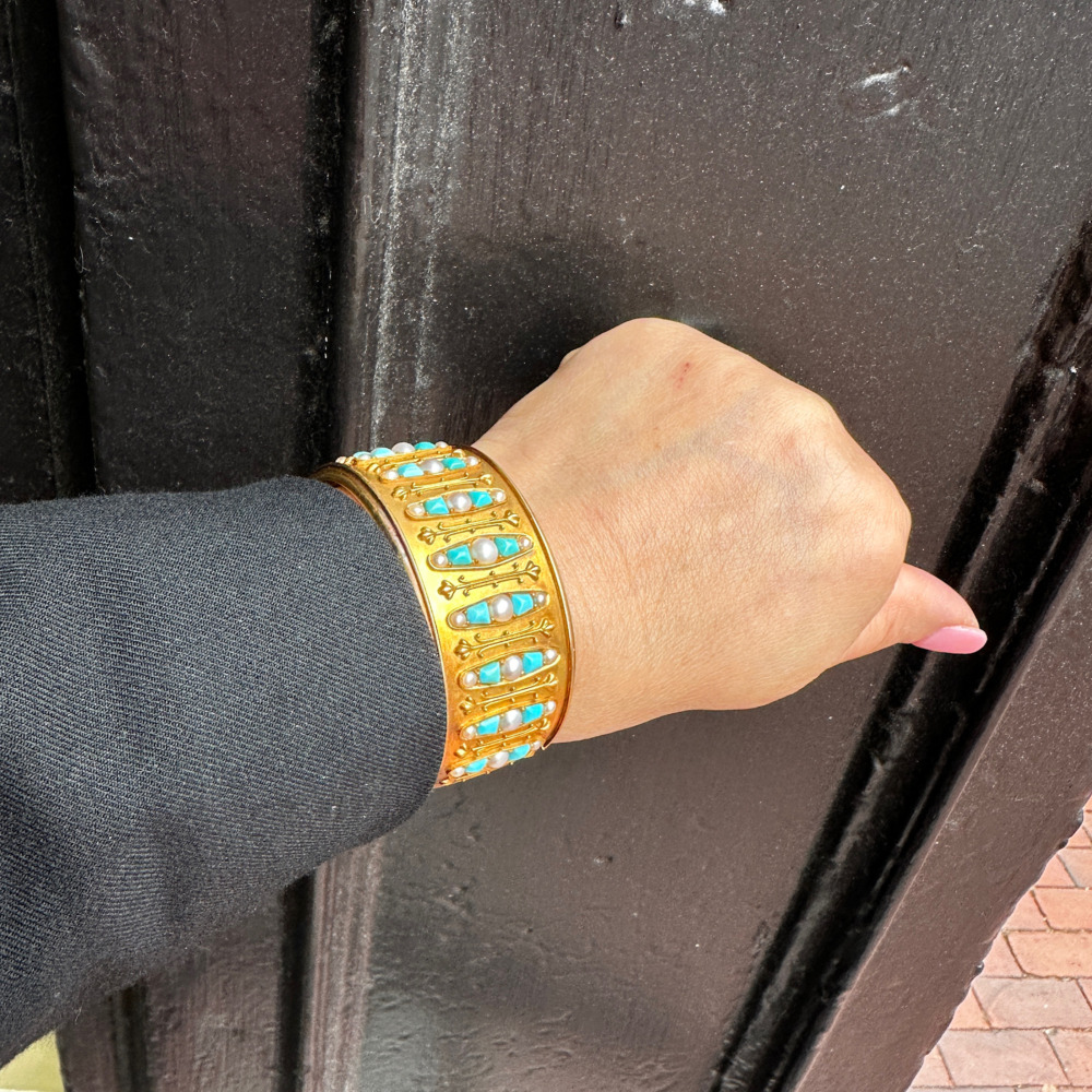 The wide Etruscan style set with calibre cut turquoise and alternated by half seed pearls, measuring 1 ¼ inches wide and 6 ¾ inches wrist size.