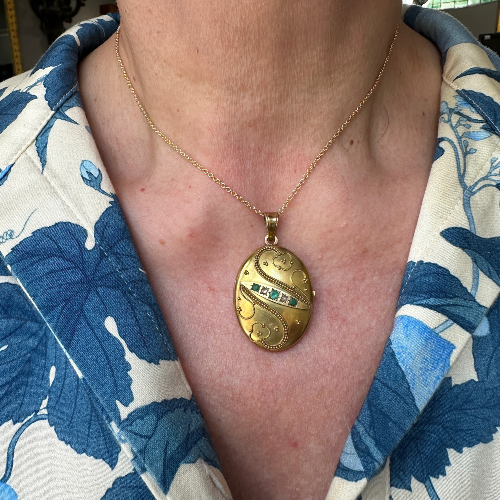 The oval-shaped locket, set with three round emeralds and two rose-cut diamonds, is decorated with wire and beadwork, measuring 1 ¼ x 1 inch.