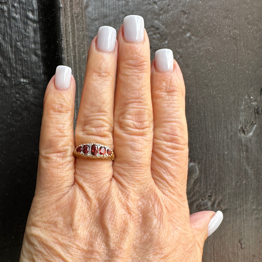 The graduated top is set with oval-shaped garnets and small round diamonds.